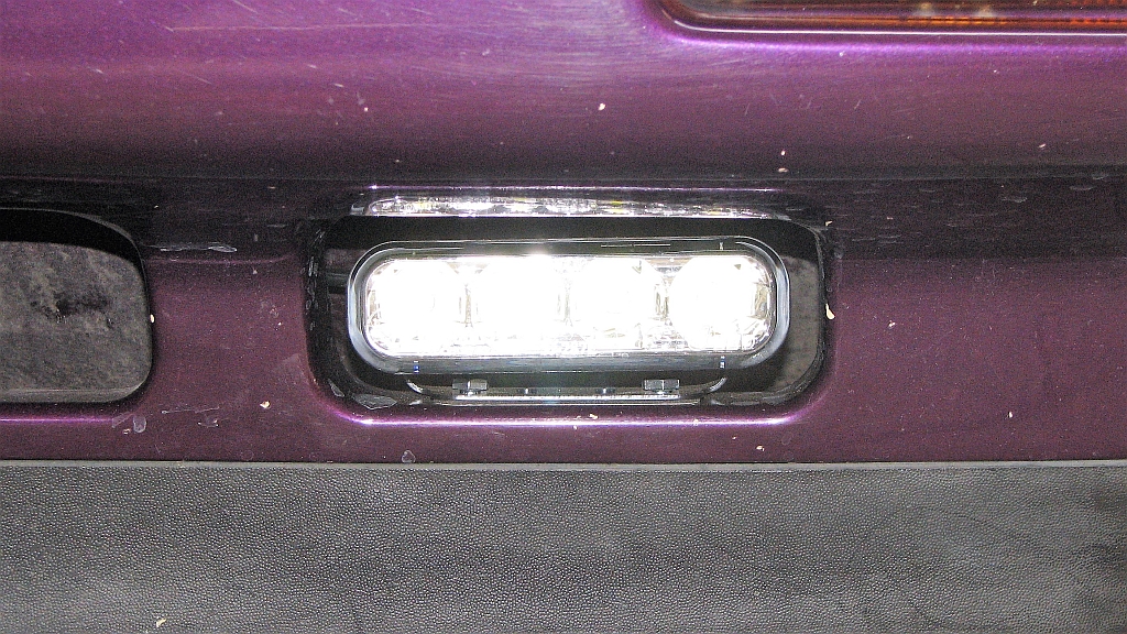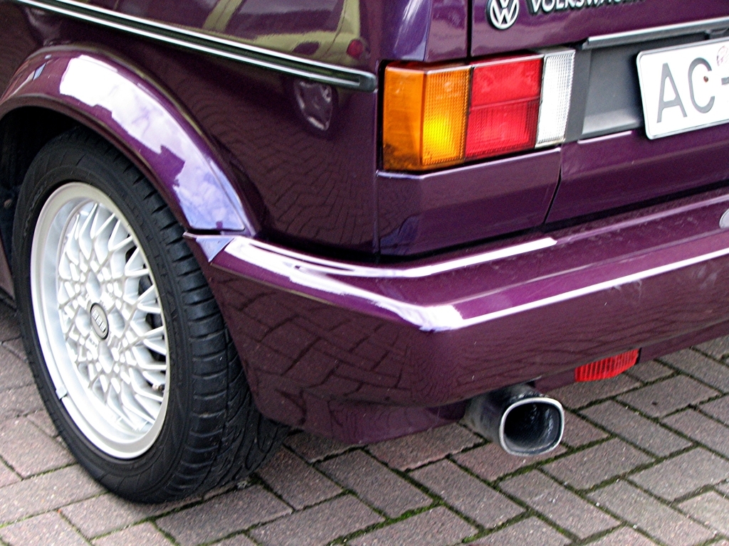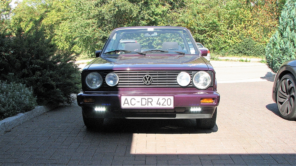 September 2020 - Noch vor den Lackarbeiten entscheiden wir uns, das Cabrio mit modernem LED-Tagfahrlicht auszustatten. Das dunkle Violet im Gegenlicht oder in der Dämmerung ist nicht unbedingt sofort zu erkennen. Und immer mit mehr als 100 Watt Fahrlicht unterwegs zu sein, wollen wir nicht. Nun gibt es in der großen Spoilerstoßstange der späten Golf 1 Cabrios eine Reihe von Öffnungen, die in erster Linie nur der Optik dienen. Vielleicht sind sie auch für Nebellicht zu gebrauchen. Wir entscheiden uns jedenfalls für LED-Tagfahrleuchten mit einer Breite von 120 mm und selbstverständlich E-Prüfzeichen - das müsste passen.