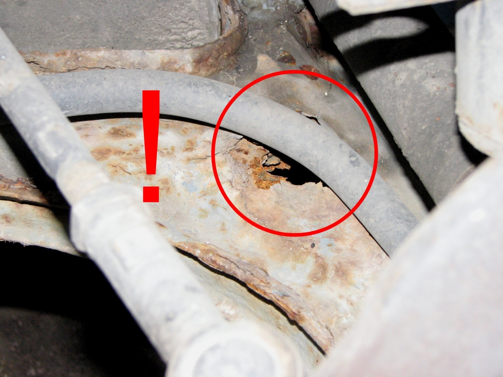 Alles ist gut, bis der Prüfer unserem Golf unter den Rock schaut. "Das müssen Sie sich ansehen!" Wir ahnen nichts Gutes. Und tatsächlich: Der rechte Querlenker ist total verrottet. Unglaublich, was da hätte passieren können.