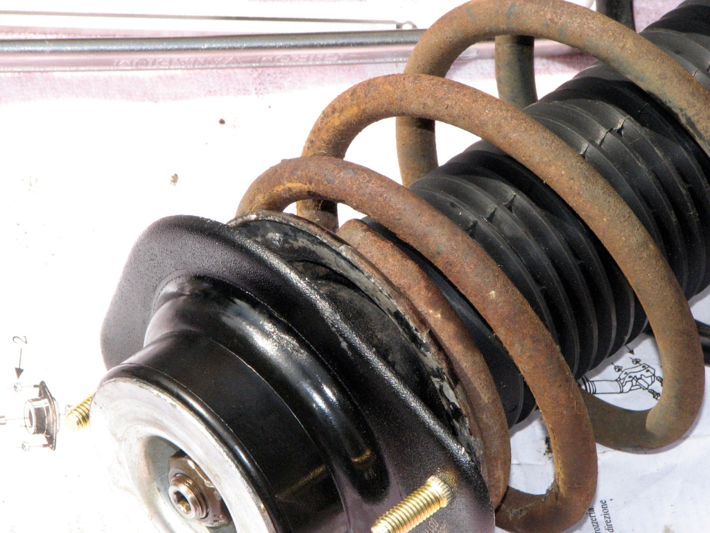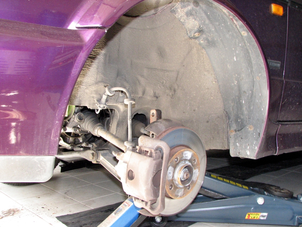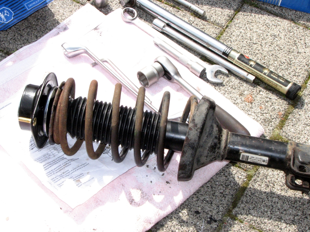 Ende April 2012 - seit geraumer Zeit haben wir das Gefühl, dass die Vorderräder unseres Cabrios "unruhig" laufen. Es ist keine Unwucht sondern eher ein Springen bei holpriger Straße. Ausserdem federt die rechte Vorderseite beim Bremsen stärker ein, als die linke. Wipptest an den Kotflügeln bestätigt: Der rechte Stoßdämpfer ist definitiv hinüber!