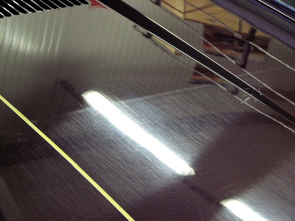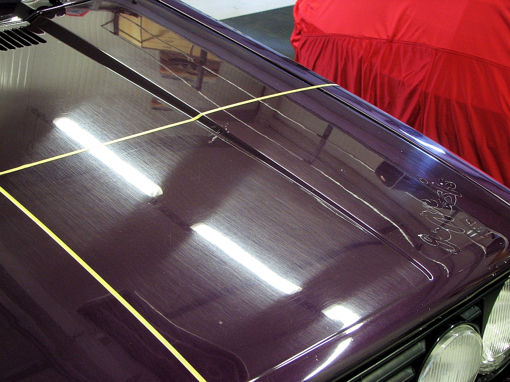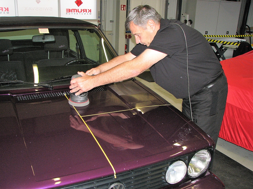 Mit diversen Gerätschaften und geheimnisvollen Tinkturen, verteilt auf Schwämme und Lammfellbürsten, geht es dem verwitterten Lack an die Pelle. Ziel ist es, quasi die feinen Riefen aus der Lackoberfläche zu "schleifen" und das so schonend wie möglich. Der Job erfordert einiges an Erfahrung, ein gutes Auge, .....und viel Geduld (oder besser: Engagement für das, was man tut.) Dieser "Reinigungsprozedur" fällt leider auch der "Genesis"-Aufkleber auf der Motorhaube zum Opfer. Der hatte über die Jahre sehr stark gelitten und sah nicht mehr wirklich schön aus.