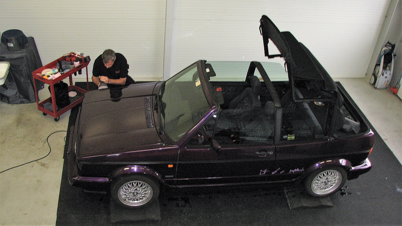 Und - heute können wir den Youngtimer sowieso nicht mitnehmen. Denn: Nach der Vorbehandlung wird der Lack versiegelt - mit Nano..., Keramik... und so. Diese spezielle Wachsschicht muss mehrere Stunden trocknen und aushärten, bevor sie den endgültigen Langzeitschutz entfalten kann. Und auf das Ergebnis gibt es sogar noch Garantie....