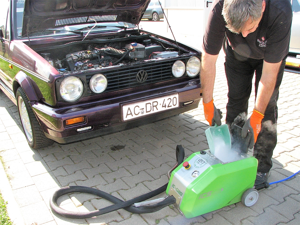 Jetzt ist es relativ einfach: Das Trockeneis, unter Druck aufgebracht,"sprengt" den Schmutz quasi von den Aggregaten weg und läßt ihn als trockenen Staub zu Boden rieseln. Aufkehren - entsorgen - fertig.