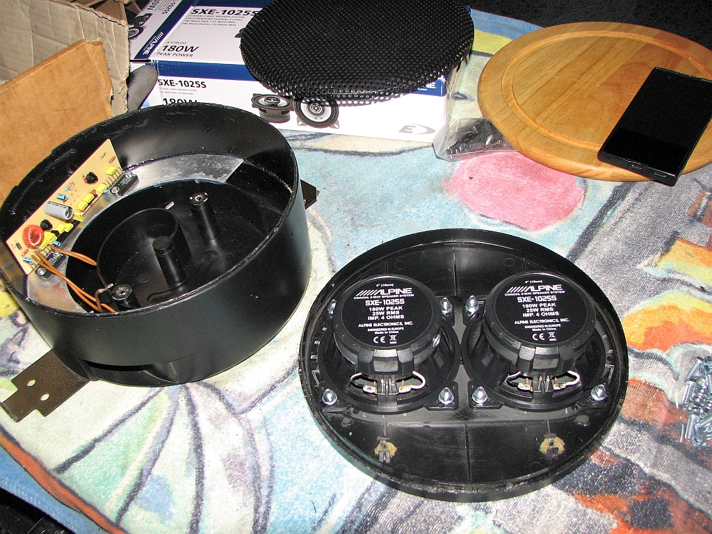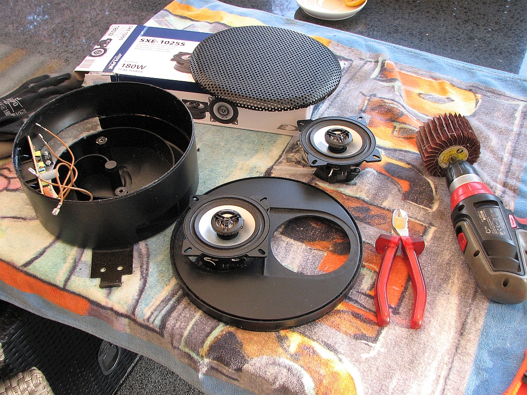 Als Ersatz für die beiden Tiefmitteltöner der Subwoofer haben wir uns je einen Set der Alpine SXE-1025S ausgesucht - 25 Watt RMS Tiefmitteltöner mit 10 cm Durchmesser. Wie kriegen wir die denn jetzt da rein? Nun - die Körbe der beiden Lautsprecher im Subwoofer sind doch tatsächlich Bestandteile der Plastikgehäuse und müssen mit Blechschere und Seitenschneider ausgebrochen werden. Jetzt alles schön glatt schleifen und die Öffnung von 9,3 auf 9,9 cm vergrößern. Je vier Befestigungslöcher für die neuen Lautsprecher anzeichnen und bohren. Lautsprecher einsetzen und verschrauben - fertig. Ach so - nicht vergessen, die Anschlusskabel von den Verstärkern zu den Lautsprechern aufzustecken. Die Stecker passen übrigens.