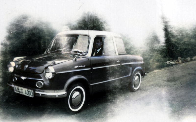 Vater Paul kann den NSU Prinz II im rechten Bild 1958 ausnahmsweise für einen Besuch nach Nothberg benutzen, weil der blaue Opel Olympia schon verkauft ist und der schwarz/weisse Olympia Rekord noch nicht fertig ist.